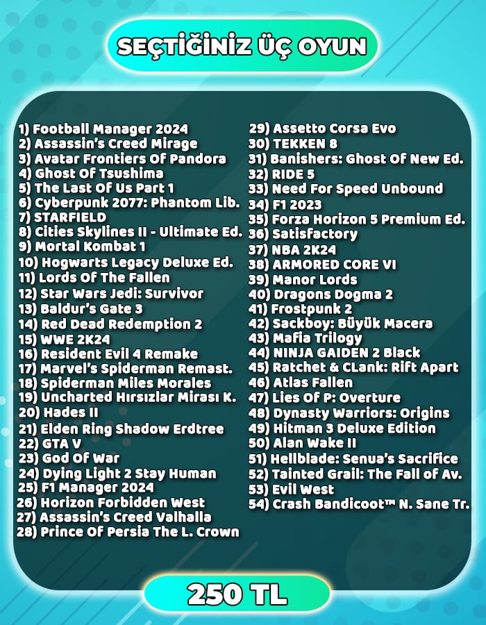 3 yıldır alışveriş yaptığım güvenilir bir satıcı çok hızlı ve ilgililer oyunların bu fiyatlara geldiği bu zamanlarda ilaç gibiler